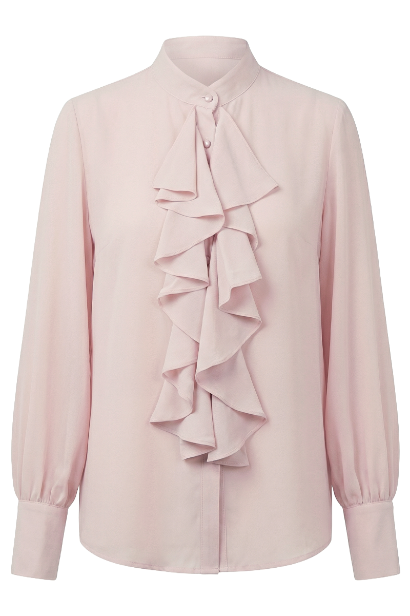 Soft Ruffle je elegantna ženska bluza profinjenog i nježnog izraza, osmišljena za sofisticirane dnevne i poslovne kombinacije. Mekani, kaskadni volani duž prednjeg dijela stvaraju osjećaj lakoće i pokreta, dok zatvoreni ovratnik i čiste linije kroja daju uravnotežen i uglađen izgled. Izrađena od žoržet svile, ova bluza pruža ugodan osjećaj na koži i elegantno pada uz tijelo. Lako se kombinira s klasičnim hlačama, suknjama ili ispod sakoa, čineći je idealnim izborom za ured, sastanke i posebne prigode. Soft Ruffle suptilna je ženstvenost u modernoj interpretaciji.