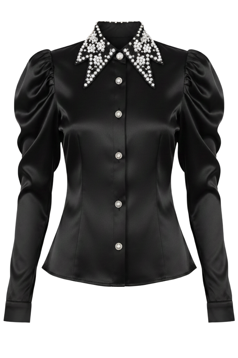 Košulja "Midnight Luxe" je vrhunski modni komad izrađen od najfinije svile, dizajniran kako bi pružio dozu elegancije i profinjenosti. Unikatnog kroja, ova košulja dolazi isključivo u elegantnoj crnoj boji koja naglašava njezinu luksuznu estetiku. S detaljima poput ukrašenog ovratnika i raskošnih rukava, ovaj model savršen je izbor za večernje izlaske ili posebne prigode.