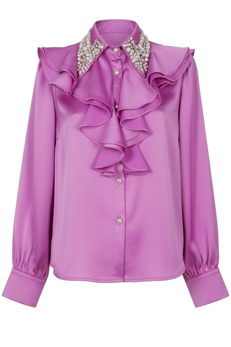 Košulja "Orchid Whisper" odiše profinjenošću i luksuzom, kombinirajući elegantne volane s ukrašenim ovratnikom za dodatni dojam glamura. Izrađena od svilenkaste tkanine, ova košulja savršeno pristaje za formalne prilike ili svečane večere, a njezin dizajn jamči isticanje u svakoj prilici. Idealna za svečane večere, poslovne sastanke ili isticanje na formalnim događajima.