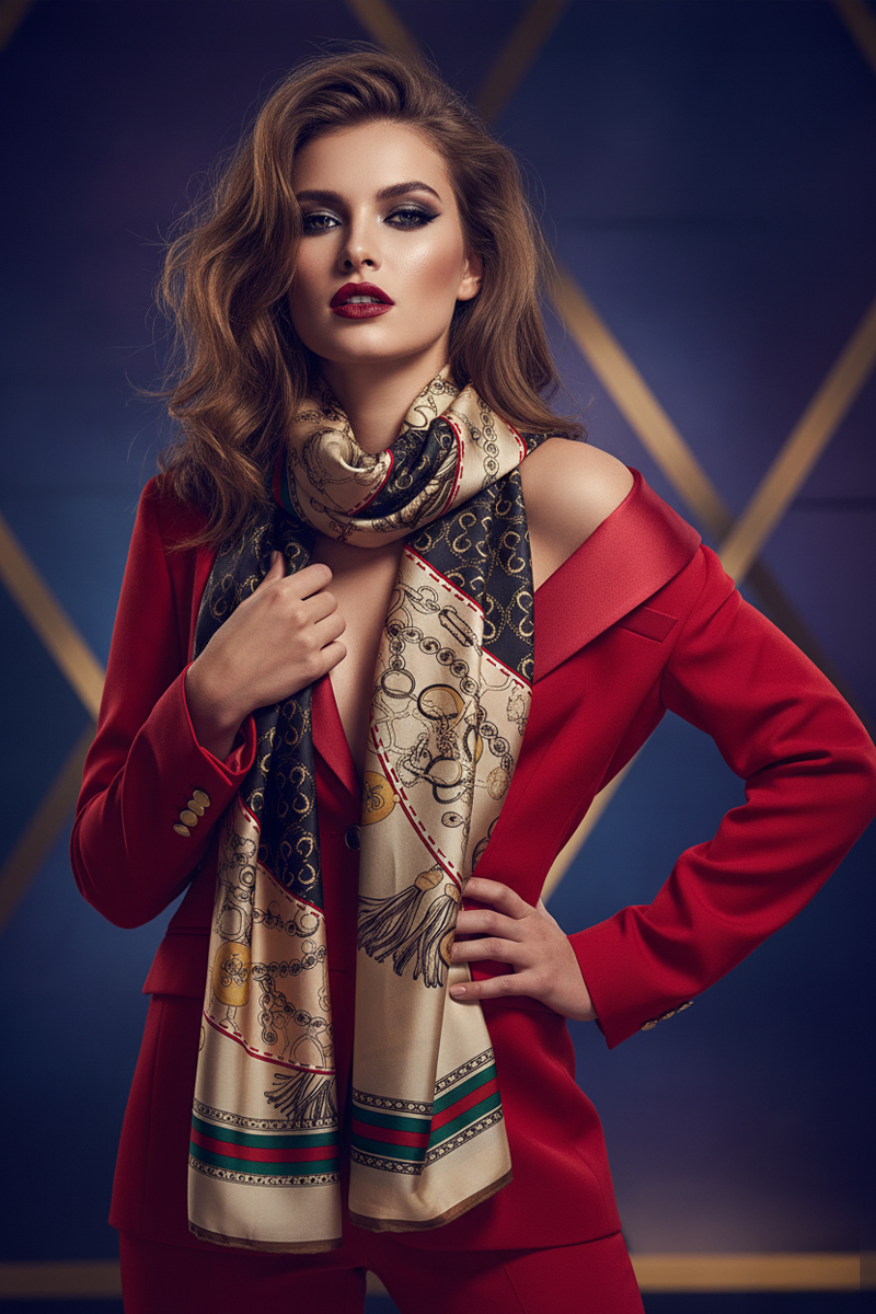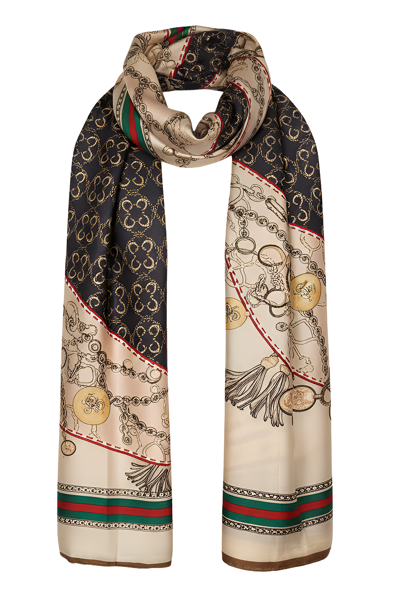 Svileni šal "Royal Medallion" odiše luksuzom i klasičnom elegancijom zahvaljujući svilenoj teksturi i raskošnom dizajnu s motivima lanaca, medaljona i ukrasnih detalja. Idealan je dodatak koji naglašava profinjenost i unosi glamurozan završni dojam u svaku kombinaciju. Bež i tamnoplava podloga s crveno-zelenim akcentima čini ga savršenim izborom za isticanje osobnog stila. Može se nositi na različite načine – omotan oko vrata, prebačen preko ramena ili kao detalj na torbi. Posebno se ističe u poslovnim, večernjim i elegantnim outfitima.