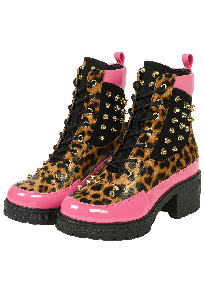 Gležnjače "Glam Hunter" savršen su spoj divljeg uzorka i modernog dizajna, idealne za one koji žele unijeti dozu odvažnosti u svoj stil. Ove upečatljive gležnjače izrađene su od visokokvalitetnih materijala, s leopard uzorkom i kontrastnim ružičastim detaljima koji ističu vaš modni izraz. Zlatne zakovice dodaju glamurozan i hrabar efekt, dok robusni đon osigurava udobnost i stabilnost. Idealne za casual i urbane kombinacije s dozom ekstravagancije.