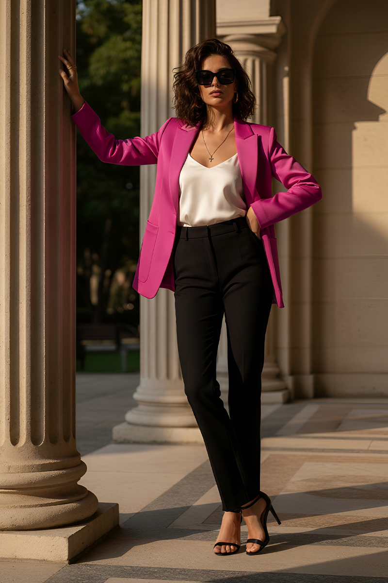 Sako "City Grace" savršena je kombinacija elegancije i modernog stila, prilagođena za različite prigode. Njegov minimalistički kroj i kvalitetni materijali osiguravaju sofisticiran izgled i udobnost. Zahvaljujući suptilnim detaljima, ovaj sako ističe vašu osobnost i unosi dašak urbane elegancije u svaki outfit. Diskretno krojeni džepovi i moderni gumbi. Odličan izbor za poslovne, svečane ili ležerne kombinacije.