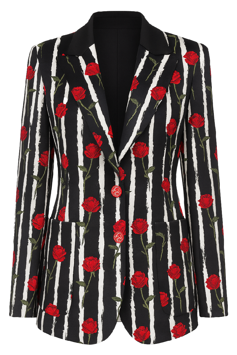 Sako "Rose Parade" donosi spoj klasične elegancije i razigranog uzorka koji će zasigurno privući pažnju. Izrađen od kvalitetnog materijala, ovaj sako u osnovnoj tamnoj boji krase upečatljive crvene ruže i linije koje stvaraju dinamičan kontrast. Krojen je s naglaskom na struk, pružajući sofisticiran izgled uz modernu dozu živahnosti. Savršeno se uklapa u poslovne i casual kombinacije, idealan za posebne prilike.