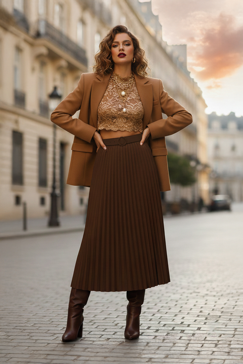 Suknja "Bella Wave" savršena je za one koji žele spojiti klasičnu eleganciju i suvremeni stil. Njen plisirani dizajn i lagani materijal osiguravaju profinjen izgled i udobnost pri svakom koraku. Ova suknja idealna je za poslovne prilike, svečane događaje ili večernje izlaske, omogućujući vam da uvijek budete u središtu pažnje. Lagana i kvalitetna tkanina koja prati liniju tijela. Kombinirajte je uz bluze, košulje ili elegantne topove za sofisticirane outfite.