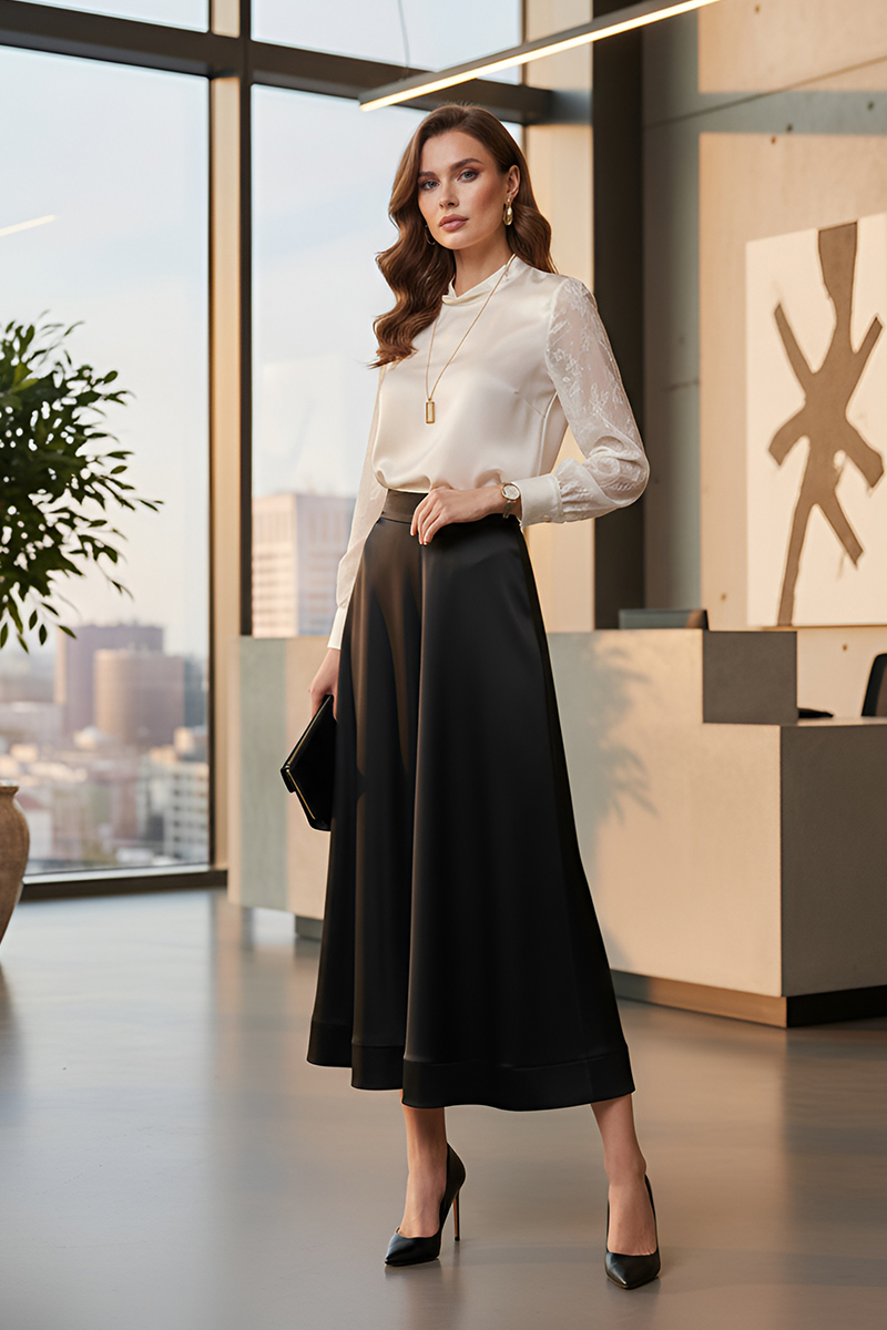 Suknja "Majestic Cascade" donosi spoj elegancije i udobnosti za sve prigode. Njena fluidna silueta i blago padajući kroj stvaraju profinjen izgled koji laska svakoj figuri. Dizajnirana s pažnjom na detalje, ova suknja je savršen izbor za sofisticirane modne kombinacije. Mekana i kvalitetna tkanina koja osigurava ugodno nošenje. Klasičan A-kroj koji ističe struk i omogućava slobodu pokreta. Idealna za svečane, poslovne i casual kombinacije.