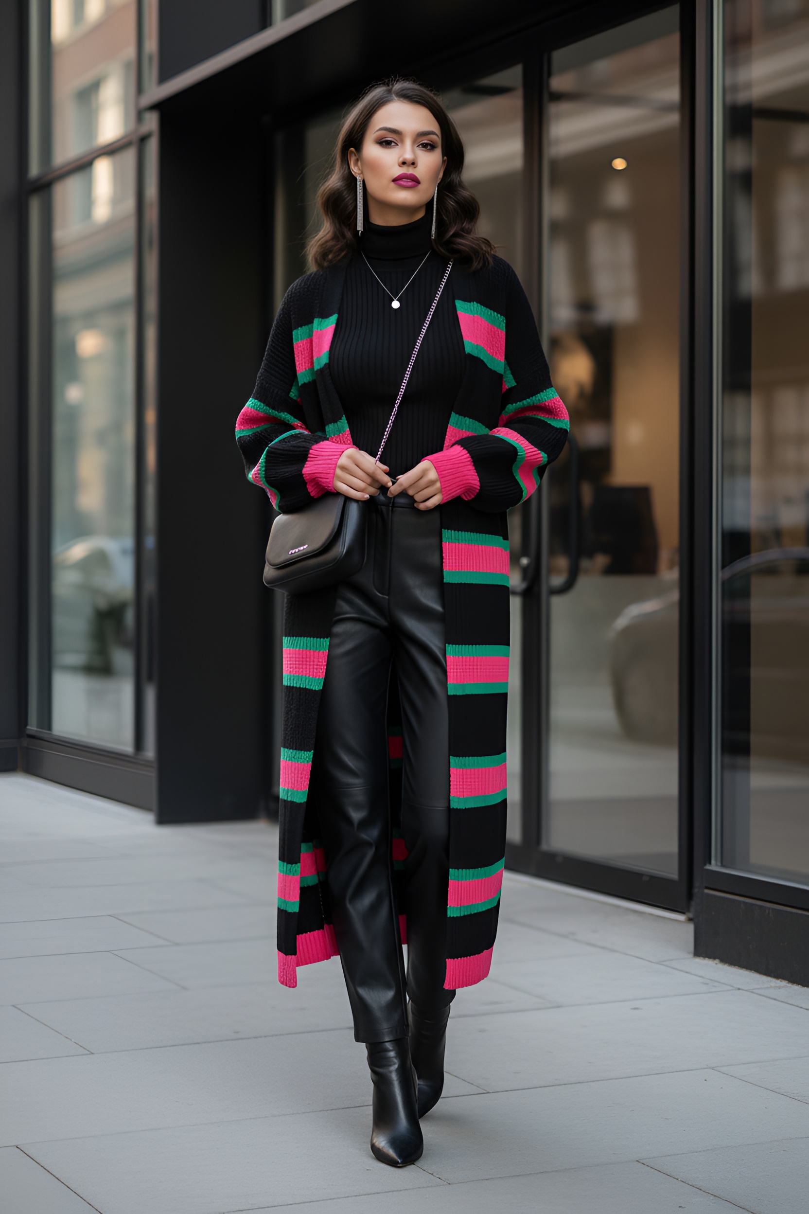 Kardigan "Neon Stripe" donosi živahnu energiju s upečatljivim prugama u crnoj, neon zelenoj i ružičastoj boji. Izrađen od mekane i tople pletene tkanine, ovaj komad pruža savršen spoj udobnosti i modernog stila. Savršen je za opuštene dane i casual kombinacije, ističući vaš jedinstveni modni izričaj. Unesite odvažnost u svoj stil.